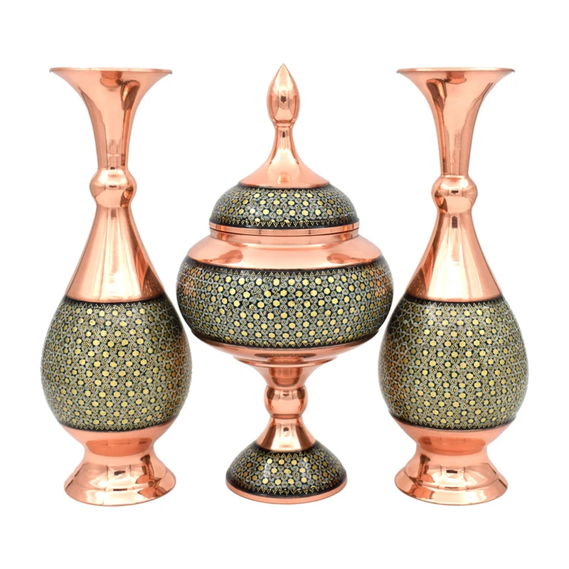A luxurious handmade 3-piece set featuring traditional Persian Khatamkari (marquetry inlay) on a copper base, including two vases and one candy/nut dish. This intricate Iranian handicraft showcases precise geometric patterns with wood, bone, and metal inlays, perfect for elegant home decor, gifting, or serving sweets in authentic style.