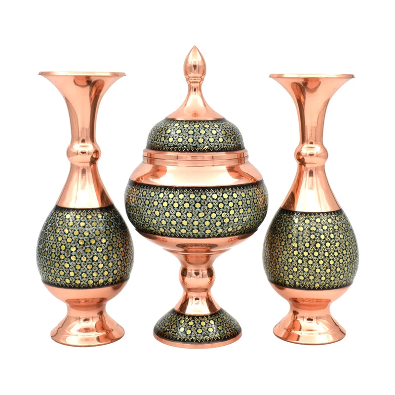 A luxurious handmade 3-piece set combining traditional Persian Khatamkari (marquetry inlay) with a copper base, including two vases and one candy/nut dish. This exquisite Iranian handicraft features intricate geometric mosaic patterns, ideal for elegant home decoration, gifting, or serving sweets in authentic Persian style.