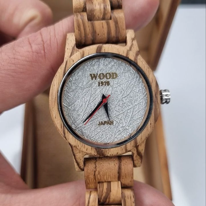 This handcrafted wristwatch from WOOD 1970 blends natural bamboo craftsmanship with minimalist Japanese precision. The textured silver dial, reminiscent of leaf veins or cracked stone, creates a striking contrast against the warm bamboo casing and band. The dial features gold-printed branding, including “WOOD,” “1970,” and “JAPAN,” adding a vintage touch to its modern silhouette. The watch is powered by a reliable quartz movement, ensuring accurate timekeeping. Its 36mm case size offers a balanced fit for both men and women, while the red minute hand adds a bold visual accent. The bamboo band is lightweight, breathable, and naturally hypoallergenic, making it ideal for daily wear. This watch is perfect for eco-conscious individuals who appreciate subtle elegance and natural materials.