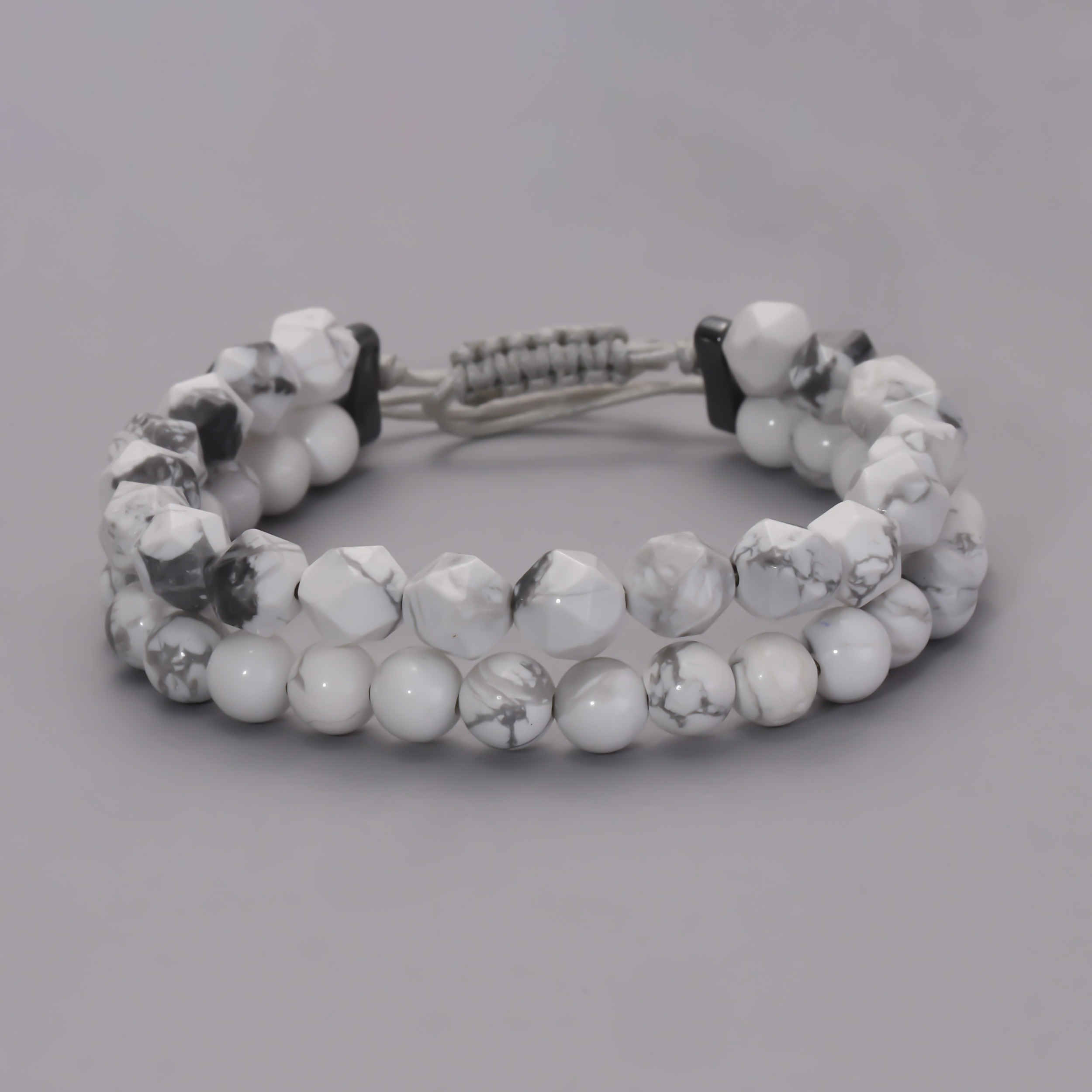 This double‑row bracelet is made from natural howlite beads whose white surface is marked by striking gray veining, giving each bead a distinct, eye‑catching pattern. The design pairs a lower row of smooth, round beads that sit softly against the skin with an upper row of faceted, edged beads that catch light and add subtle texture and dimension. A handcrafted knot closure provides secure, easy adjustment and reinforces the artisanal feel of the piece. Howlite is traditionally valued for its calming influence on the mind, its reputed ability to reduce anxiety and improve sleep quality, and for encouraging patience and emotional balance; many practitioners also use it during meditation to quiet racing thoughts and foster self‑awareness. The neutral white‑and‑gray palette and layered double‑row construction make the bracelet versatile and suitable for any wardrobe, while its unisex design ensures it can be worn comfortably by all genders.
