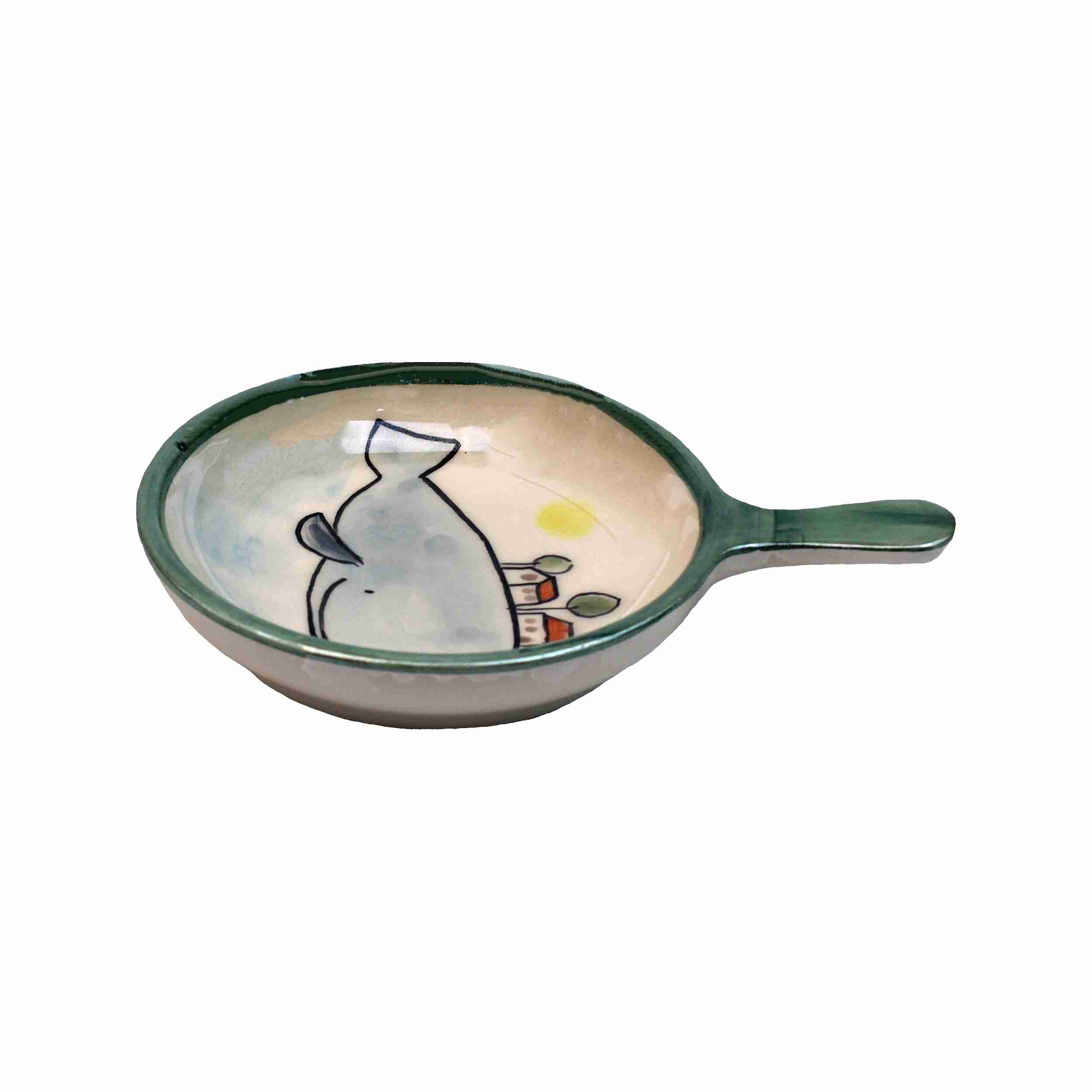 A whimsical miniature pan‑style dish glazed to a soft glossy sheen, its pale blue basin evoking shallow sea while a deep green rim and handle frame the scene. At the center, a contented grey whale drifts in a painterly outline, accompanied by two red‑roofed houses, sprigs of trees, and a pale yellow sun—each hand‑painted stroke suggesting a tiny coastal story. Perfect as a spoon rest, petite serving plate, or a singular decorative talisman, this piece brings playful narrative and handcrafted charm to tabletops; handwash to preserve the delicate painted surface. you could also use this fabulous dish to put your jewelry in it or to hold a beautiful handle and lighten up the dark.