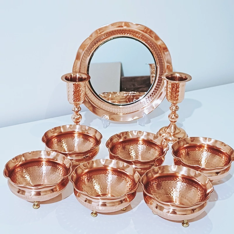 - Complete Decorative Set: Includes a mirror, candle holders, and copper bowls for Haft-Sin or table décor.