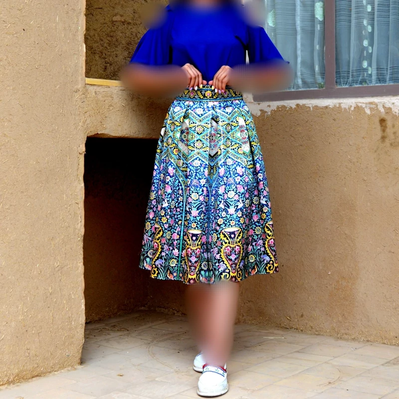 This skirt is a celebration of sacred geometry and color—its thick satin pleated into a flowing midi silhouette, adorned with tile motifs inspired by Islamic architecture. The design unfolds across a luminous canvas where turquoise, sapphire, jade, golden yellow, and soft pink dance in perfect harmony. The upper section features structured horizontal bands that echo the framing of mosque mosaics, while the lower hem blossoms into a vibrant composition of floral arabesques and interlaced geometry. The palette evokes the serenity of Persian courtyards and the poetic light of stained-glass windows. With its elastic waistband and unlined interior, this skirt offers comfort and cultural richness—ideal for spring ceremonies, artistic gatherings, or any moment that calls for radiant elegance.