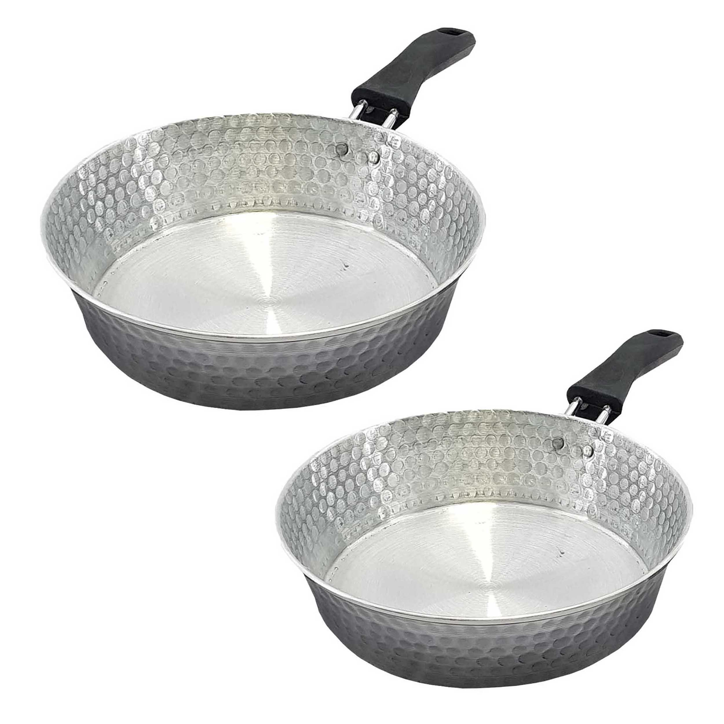 This two-piece non-stick frying pan set includes 20 cm and 22 cm pans made from aluminum with a traditional hammered finish and sturdy handles for easy handling. The non-stick coating ensures effortless cooking and easy cleaning, while the aluminum construction provides fast and even heat distribution, reducing hot spots for perfectly cooked meals. Ideal for frying, sautéing, and preparing a variety of everyday dishes, these pans are lightweight yet durable, and the handles make them comfortable to lift and maneuver. A practical and economical cookware set that combines classic hammered design with reliable non-stick performance for daily home use.